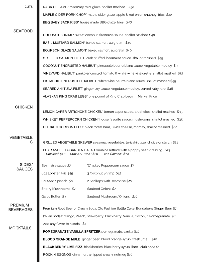 Our signature cuts include perfectly cooked Filet Mignon, Rib Eye, and our famous Prime Rib—available in Standard or Carvers Cut sizes. Prefer something from the sea? Try our Coconut Encrusted Halibut, Stuffed Salmon Fillet, or the indulgent Alaskan King Crab Legs.